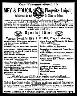 Im Jahr 1884 begann Mey zusätzlich mit der Produktion von Celluloid-Waren. Er errichtete dazu 1887 ein Zweigwerk zur Herstellung von Cellulosenitrat und Zelluloid im preußischen Eilenburg, aus dem 1890 die selbstständige Deutschen Celluloidfabrik Actiengesellschaft und später das Eilenburger Chemiewerk hervorgingen. Mit der Herausgabe des ersten illustrierten Warenkatalogs im Jahr 1886 gilt Mey als Begründer des deutschen Versandhandels.