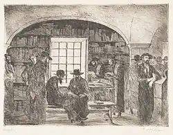 Ende 1914 wurde Oppler zum Kriegsdienst eingezogen. Anfangs an der Westfront, wurde Oppler 1915 an die Ostfront versetzt. Dort kam er in Kontakt mit dem traditionellen Judentum, das ihm als assimilierten Juden einerseits fremd erschien, andererseits auch sein Interesse weckte. Ende 1915 nach Berlin zurückgekehrt verarbeitete er die Erlebnisse in Radierungen und Gemälden,[31] darunter in dem Mappenwerk Hinter der Front der Kaiserlich Deutschen Armee, welches 1916 auch in der amtlichen Deutschen Kriegsausstellung gezeigt wurde.[32]