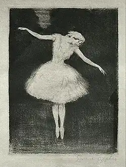 Ab 1909/1910 skizzierte und radierte er viele Darstellungen des populären Russischen Balletts. Seine Eindrücke von den Tanzaufführungen hielt Oppler unmittelbar während der Theaterbesuche fest, wofür er einen speziellen beleuchteten Zeichenstift erfand, der ihm das Skizzieren seiner Eindrücke von der Bewegung im abgedunkelten Zuschauerraum ermöglichte. Auf dem Gebiet der Darstellung von Ballettszenen wurde er der bedeutendste deutsche Chronist des künstlerischen Tanzes. Später rekonstruierte und konkretisierte er seine skizzierten Momenteindrücke von bewegten Figuren in Zeichnungen, Radierungen, Lithographien, Aquarellen und Gemälden. Ausdrucksstark waren die malerischen Tonwerte seiner Radierungen, die er durch flächige Aquatintakörnung und Weichgrundätzungen erzeugte. Diese Technik ermöglichte ihm ein breites Spektrum an Hell-/Dunkelwerten. Ernst Oppler blieb zeitlebens ein distanzierter, leidenschaftlicher Beobachter und kultivierter Ästhet des Balletts, dies brachte ihm den Spitznamen der Tanzmaler ein. Anders als Edgar Degas, der zuvor schon namenlose Ballerinen in der Pause, beim Training, Schnüren der Ballettschuhe und Verbeugen dargestellt hatte und als Ballettmaler galt, eigentlich aber nur ein Genre festhielt, stand bei Oppler die tänzerische Bewegung selbst, das jeweilige Ballettwerk und der individuelle, meist prominente Künstler im Vordergrund (Anna Pawlowa, Tamara Karsavina, Vaslav Nijinsky u. v. a.).[27] Bald wurde Oppler explizit eingeladen, bei den Proben und Aufführungen zu zeichnen, dadurch sind beispielsweise Proben mit Richard Strauss in Paris durch Zeichnungen und Radierungen dokumentiert.[28]