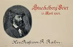 1860 wurde Stückelberg von Jacob Burckhardt dazu angeregt, einen Entwurf für das geplante St. Jakobs-Denkmal in Basel anzufertigen. Der Entwurf stiess bei der zuständigen stadträtlichen Kommission auf Anerkennung. Der in Rom niedergelassene Bildhauer Ferdinand Schlöth, dem in dem ein Jahr zuvor durchgeführten Wettbewerb für seinen Entwurf der erste Preis zuerkannt worden war, war jedoch nicht bereit, einen von fremder Hand ausgeführten Entwurf umzusetzen, wiewohl er mit Stückelberg während dessen Romaufenthaltes einen freundschaftlichen Umgang gepflegt hatte.[2]