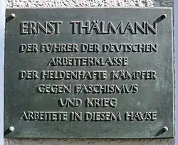 Nachdem das durch die Schlacht um Berlin schwer zerstörte Karl-Liebknecht-Haus wiederaufgebaut worden war, enthüllte der Präsident der DDR Wilhelm Pieck am ehemaligen Sitz der KPD und Arbeitsstätte Thälmanns im Rahmen einer Massenveranstaltung am 16. April 1952 eine Gedenktafel zu Ehren des KPD-Vorsitzenden im Eingangsbereich des Hauses. In den Jahren 1978 bis 1980 wurde der Erdgeschoßbereich aufwendig zur größten Thälmann-Gedenkstätte der DDR umgebaut.[71] Neben Fotos, Plakaten und Publikationen wurden auch Handschriften Thälmanns ausgestellt sowie Modelle der Haftanstalt Bautzen und des Krematoriumhofs des ehemaligen KZ Buchenwalds. Die Gedenkstätte verfügte über eine Schallplattenaufnahme als einzig bekannte Aufzeichnung der Stimme Thälmanns aus dem Reichstagswahlkampf 1928. Nach der Auflösung der Gedenkstätte ging die Schallplatte in den Fundus des Deutschen Historischen Museums über.