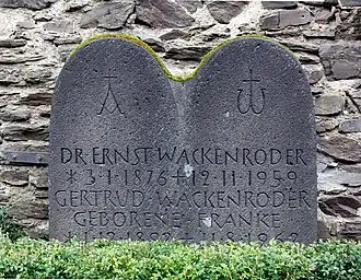 Ernst Wackenroder ist auf dem Friedhof von Karden am alten Kirchturm beerdigt. Eine Gedenktafel erinnert an sein Werk.