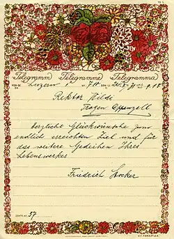 «Die Universität Zürich unter dem Rektorate des Herrn Professor Dr. jur. utr. Ernst Hafter verleiht durch die Philosophische Fakultät unter dem Dekanate des Herrn Professor Dr. phil. et med. Arthur Wreschner mit dieser Urkunde kraft des ihr gesetzlich zustehenden Rechtes Herrn Ernst Wildi aus Wiggiswil (Bern), Rektor der Kantonsschule Trogen, der durch sein überlegenes pädagogisches Geschick und seine starke Persönlichkeit die ihm anvertraute Schule zu einer vorbildlichen machte, ehrenhalber die Würde eines Doktors der Philosophie.»