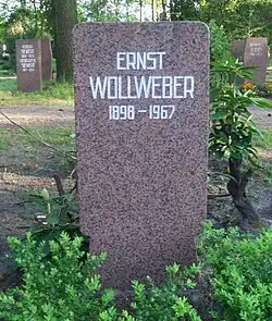 Im Januar 1958 ließ Ulbricht gegen Wollweber ein Parteiverfahren wegen „Verstößen gegen das Parteistatut“ einleiten, und das ZK der SED schloss ihn zusammen mit Karl Schirdewan wegen „Fraktionstätigkeit“ aus. Er erhielt eine „strenge Parteirüge“ und musste sein Mandat für die Volkskammer niederlegen; er vereinsamte privat und wurde zur Unperson.[14] Bild und Name Wollwebers verschwanden aus den Werken zur Parteigeschichte, zur Geschichte der DDR und über den antifaschistischen Widerstandskampf. Interne Darstellungen zur Geschichte des MfS nannten ihn, wie auch seinen Vorgänger Zaisser, nicht. Er lebte bis Anfang der 1960er Jahre zurückgezogen in seiner großen Wohnung in der Ost-Berliner Stalinallee 110 und schrieb an einer Autobiografie, die mit dem Jahr 1947 abbrach. Wollweber, nach seinem Sturz von Lebensgefährtin und Adoptivtochter verlassen, heiratete 1960 eine 27 Jahre jüngere Frau. Das Paar zog nach Berlin-Hirschgarten. Seinen Tod am 3. Mai 1967 meldete die SED-Kreisleitung Berlin-Köpenick im Zentralorgan Neues Deutschland mit einwöchiger Verspätung in einer Neun-Zeilen-Notiz.[15] Einzelheiten zu Wollwebers Urnenbeisetzung legte das Sekretariat des Politbüros der SED fest. Sie fand in der Gräberanlage „Pergolenweg“ des Zentralfriedhofs Friedrichsfelde in Berlin-Lichtenberg unter Beteiligung einer Ehrenwache des MfS statt.[16]