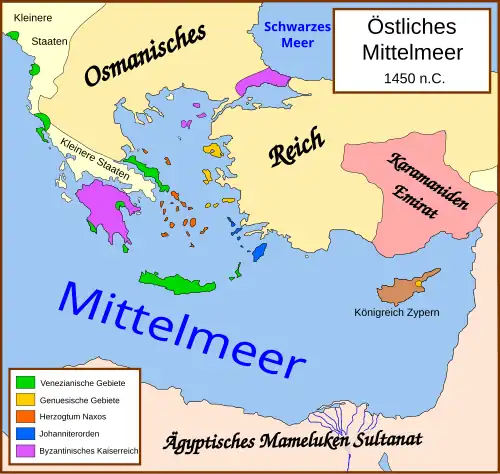 | Ausgang | Eroberung Konstantinopels durch die Osmanen und Ende des Byzantinischen Reiches | ||||||||||||||||
