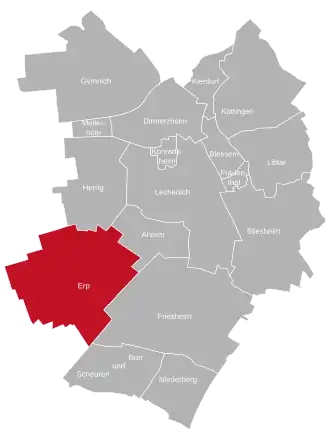 Am 1. Juli 1969 wurde Erp ein „Stadtteil“ der neu geschaffenen Stadt Erftstadt, einem Zusammenschluss größerer und kleinerer Orte rechts und links der Erft.[44] 1975 wurde Erftstadt vom Kreis Euskirchen an den neuen Erftkreis abgetreten, der 2003 in „Rhein-Erft-Kreis“ umbenannt wurde.
