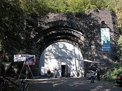 Der Aufstieg zum gut sichtbaren Stollen auf halber Höhe empfiehlt sich nicht. »Durch die Öffnung in der Felswand schwebte einst eine Materialseilbahn, mit der Basaltsteine zum Rhein auf Schiffe befördert wurde. Der Stollen führt durch den ganzen Berg bis zur hinteren Flanke der Steilwand, wo früher der Basalt gebrochen wurde.«[3][4]