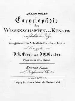 Die Veröffentlichung der unvollendeten Allgemeinen Encyclopädie der Wissenschaften und Künste, in alphabetischer Folge wurde 1818 von Ersch und Gruber begonnen; bis 1889 erschienen 167 Text-Bände und ein Tafelband. Es handelt sich um eine wissenschaftliche Enzyklopädie, die von über 400 Mitarbeitern erarbeitet wurde und knapp 79.000 Seiten in drei Sektionen umfasst.