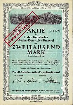1931 wurde der Sitz der Brauerei von Dresden nach Kulmbach verlegt. Zwei Jahre später vermeldet der Vorstand die Erschließung neuer Absatzgebiete und sogar die Bierausfuhr in die USA.[2]