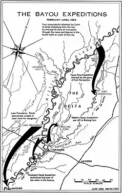 Shermans Korps sollte den schon im vergangenen Jahr begonnenen Kanal durch die De Soto Halbinsel fertigstellen. Nach der Fertigstellung sollten Kanonenboote und Transportschiffe, ohne von der Artillerie in Vicksburg beschossen werden zu können, den Mississippi südlich von Vicksburg erreichen und eine Landung dort unterstützen. Die Arbeiten begannen am 24. Januar und wurden durch anhaltende Regenfälle, die das Grundwasser und die Flüsse im Delta steigen ließen, behindert. Grant setzte zur Unterstützung der Soldaten Shermans zusätzlich dampfgetriebene Schwimmbagger ein und meldete die Fertigstellung der Arbeiten zunächst bis Anfang, später bis Ende März. Das Hochwasser führte im März zu einem Dammbruch am Einlass des Kanals und am 29. März zum Abbruch des Unternehmens.