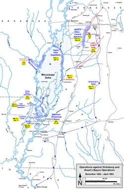 Grant richtete sein Hauptquartier am 30. Januar 1863 bei Millikens Bend ein und übernahm die Führung des Feldzuges gegen Vicksburg persönlich.[25] Der Kommandobereich wurde auf die Gebiete westlich des Mississippi ausgedehnt, die Grant für die Durchführung des Feldzuges benötigte. Grant war überzeugt, Vicksburg mit den zur Verfügung stehenden Kräften einnehmen zu können; die Einnahme sei nur eine Frage der Zeit. Wegen der stark befestigten Ufer, war das Ziel von nun an, die Tennessee-Armee zunächst auf dem Höhengelände nördlich oder südlich von Vicksburg auf dem Ostufer des Mississippi zu positionieren und anschließend von dort aus Vicksburg anzugreifen.[26] Die vier Korps der Tennessee-Armee waren wie folgt räumlich verteilt: