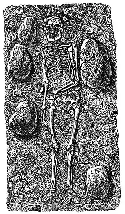 Bestattungen fand man vor allem in den Muschelhaufen. Gräberfelder sind aus Vedbæk (Gräberfeld von Bøgebakken) und Skateholm I + II[12] bekannt. Neuere Untersuchungen (1978–1987) stammen vom Fundplatz Tybrind Vig in der Nähe von Middelfart auf Fünen, darunter eine Doppelbestattung. Raymond Terrace in fand an der Køge Bucht ein Kollektivgrab mit acht Toten, von etwa 4600 v. Chr.[13]