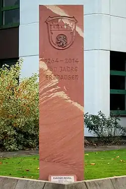 - ↑ Genehmigung eines Wappens der Gemeinde Erzhausen (Punkt 706) durch den Hessischen Minister des Innern vom 7. Mai 1973. In: Staatsanzeiger für das Land Hessen. 1973 Nr. 23, S. 1007 (Online beim Informationssystem des Hessischen Landtags [PDF; 6,4 MB]).