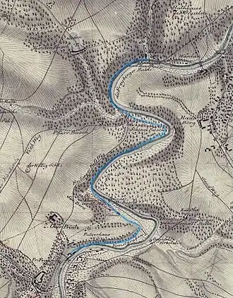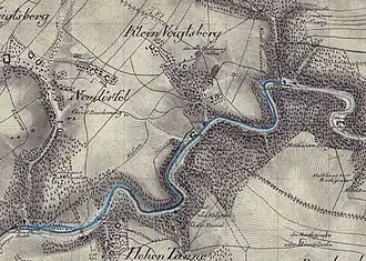 ![]() markierter Kanalverlauf (ab 1823) auf einem Meilenblatt von 1786 mit Nachträgen bis 1876 | ||
