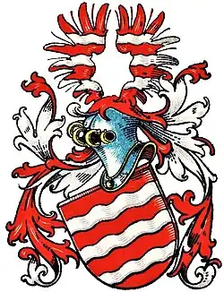 - Blasonierung des Stammwappens: In Rot drei silberne Wellenbalken. Auf dem Helm ein offener roter Flug, die Flügel jeweils mit den drei Wellenbalken belegt. Die Helmdecken sind rot-silbern.