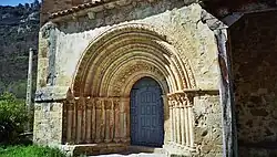 - Die Pfarrkirche Santa María ist – mit Ausnahme der Strebepfeiler – aus nur grob behauenen Bruchsteinen errichtet. Das unterhalb des Glockenturms (campanario) auf der Südseite befindliche Portal stammt von einem mittelalterlichen Vorgängerbau. Sein Gewände ist mehrfach zurückgestuft; die Archivolten zeigen sowohl figürliches (Älteste der Apokalypse) als auch geometrisches Dekor. Die schlanken figurlosen Kapitelle der eingestellten Säulen weisen auf den Übergangsstil zwischen Spätromanik und Frühgotik hin. Die Zwickel der Portalzone waren mit Fugenmalereien und anderem Dekor bemalt.