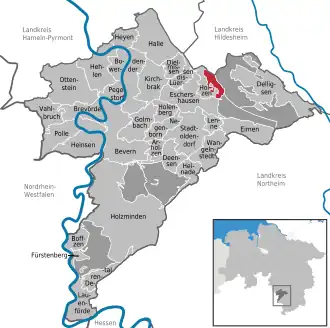 Es hat eine Fläche von 4,92 km²[1] und grenzt im Uhrzeigersinn im Osten an das gemeindefreie Gebiet Grünenplan, im Süden an das gemeindefreie Gebiet Eimen und die Stadt Eschershausen und im Westen an die Gemeinde Holzen des gleichen Landkreises. Im Norden besteht ein kurzer Grenzabschnitt zur Gemeinde Duingen im Landkreis Hildesheim.