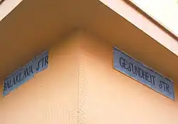 Zwei steinerne Straßenschilder erinnern daran, dass die „Neustraße“ ursprünglich „Gesundheitstraße“ und die „Uferstraße“ erst „Balaklavastraße“ hießen. Bei der heute ukrainischen Stadt Balaklawa fand 1854 im Krimkrieg die für das Vereinigte Königreich von Großbritannien und Irland siegreiche Schlacht von Balaklawa gegen Russland statt. Und in der „Gesundheitstraße“ stellte eine Kaffeerösterei „Gesundheitskaffee“ her. 2004 wurde an dieser Ecke eine Indeterrasse gebaut; bis 1973 standen dort Häuser.