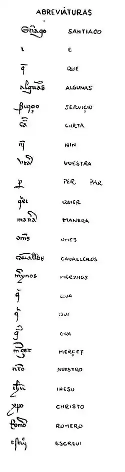 Aus Platz- und Zeitgründen wurden in den damaligen Dokumenten sehr viele Abkürzungen verwendet. Außerdem war Papier teuer. Je mehr auf ein Blatt kam, desto besser war es. Die einzige Ausnahme bildeten die professionellen Schreiber, die pro beschriebene Seite bezahlt wurden und deshalb lieber groß und ausschweifend schrieben. Im Gegensatz zu anderen Schreibschriften war die escritura cortesana nicht ganz so anfällig für Abkürzungen. Dennoch sind die Texte oft mit ihnen durchsetzt.[24][25]