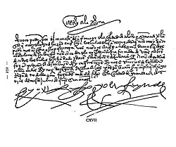 Um die Authentizität eines Dokumentes zu bekräftigen, wurden überdies häufig Siegel (sellos) oder Gegensiegel (contrasellos) darauf angebracht, die aus Wachs, aber auch aus verschiedenen Metallen, zum Beispiel Blei, sein konnten. Die spanischen Könige verwendeten vorwiegend Bleisiegel. Die Siegel der Katholischen Könige Ferdinand II. und Isabella I. zeigten auf der rechten Seite das Profil der auf dem Thron sitzenden Königin und auf der linken den König zu Pferde. Ab dem 15. Jahrhundert ersetzten die Unterschriften allmählich die Siegel.[30]