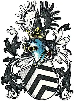 Blasonierung: In Silber drei schwarze Sparren übereinander. Auf dem gekrönten Helm ein rechts silberner und links schwarzer offener Flug, dazwischen eine schwarze Spitze. Die Helmdecken sind schwarz-silbern.[10]