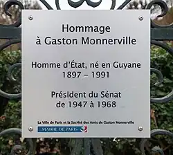 Auf Antrag der Vereinigung Freunde von Gaston Monnerville beschloss der Pariser Stadtrat unter Vorsitz von Christian Poncelet und Bertrand Delanoë den ehemaligen Jardin Cavelier-de-la-Salle neu zu benennen. Die Einweihung fand am 5. September 2006 statt.[1] Eine Büste wurde am 20. Dezember 2011 an der Esplanade eingeweiht. Sie ist das Werk des Bildhauers Jacques Canonici und des Gießers Jean-Jacques Avangini.[2][3]