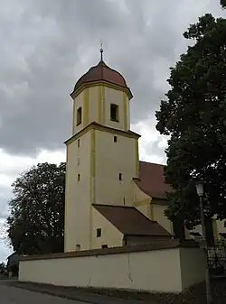 Die in der Ortsmitte an der Dorfstraße stehende katholische Kirche St. Nikolaus in quadratischer Friedhofsummauerung war eine mittelalterliche Chorturmkirche, von der sich das quadratische Untergeschoss des im Osten stehenden Turmes aus der Zeit der Gotik erhalten hat. Der Burgenforscher Helmut Rischert sieht hier den Typus einer ehemaligen Kirchenburg gegeben.[21] 1615 wurde die Kirche umgebaut; an der östlichen Turmseite findet sich deshalb ein Wappenstein des Fürstbischofs Johann Konrad von Gemmingen. Das achteckige Obergeschoss des Turmes mit Kuppelhaube stammt aus der Barockzeit von 1740; 1740/41 wurden auch das Langhaus mit dem Chorbogen und die Sakristei nach Plänen des Eichstätter Hofbaudirektors Gabriel de Gabrieli neu gebaut, das Langhaus in den Maßen 8,5 × 11,5 Meter. Der Stuck und die Kanzel stammen von Franz Xaver Horneis (1741). Der viersäulige Hochaltar und die beiden Seitenaltäre entstanden in dem Jahrzehnt nach 1740. Statt eines Altarbildes zeigt der Hochaltar heute einen gotischen St. Martin als Bischof (Figur von 1480). Weitere Figuren stammen ebenfalls aus dem 15. Jahrhundert. 1840 kam ein neuer Tabernakel in den Chor. Das mit Akanthus-Schnitzwerk versehene Orgelgehäuse wurde um 1710/20 geschaffen. Das Deckengemälde malte 1861 Michael Werner. 1921 kam eine 5-Register-Orgel vom Orgelbauer Bittner aus Eichstätt in die Kirche. 1938 hingen zwei Glocken im Turm, die eine von 1724, die andere von 1922.[22]