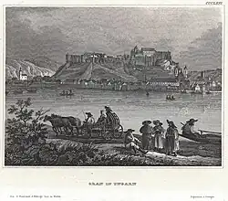 Nach der Besetzung des Landes errichteten die Römer am selben Platz das Kastell Esztergom mit einer um den Berg liegenden Siedlung und nannten den Ort Solva mansio.[3] Nach der Völkerwanderungszeit siedelten sich in den Ruinen des Kastells Slawen an. Der nun unter anderem Ostrihom[4] beziehungsweise latinisiert Strigonium genannte Ort war eine der zentralen Burganlagen des Neutraer Fürstentums und Großmährens. Ihr deutscher Name Gran leitet sich von dem Flussnamen Hron (Gran) ab, der gegenüber von Esztergom in die Donau mündet.
