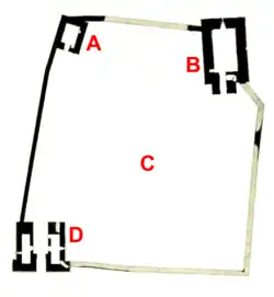 Etal Castle stand ursprünglich über einer Brücke über den Till und wurde durch steile Dämme, die zum Fluss hin abfielen, geschützt.[4][9] Die Burg bildet eine rechteckige Einfriedung, etwa 55 Meter × 49 Meter groß, geschützt durch eine mit nur 1,37 Meter Dicke relative dünne Steinkurtine.[28] Der größte, oberirdische Teil der Mauer ist zerstört und nur die Fundamente sind erhalten.[29]