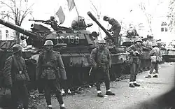 Als sie die Nachricht vom ungarischen Gegenangriff erreichte, rückte die rumänische Armee in Târgu Mureș ein, die Kampffahrzeuge kamen wegen der durch die Ungarn errichteten Barrikaden allerdings nur schleppend zum Hauptplatz voran. Die Ungarn standen der Armee nun feindlich gegenüber, weil diese erst nach ihrem Gegenangriff einschritt. Als Kincses sie bat, ließen sie die Panzer jedoch durch. Die Panzer stellten sich in einer langen geraden Linie auf und bildeten so ein breites Niemandsland. Allerdings blieben die Soldaten in ihren Fahrzeugen und versuchten nicht einmal, neuerliche Zusammenstöße zu vermeiden. In der Zwischenzeit verschärften sich die Straßenschlachten noch, auf dem Hauptplatz wurde auf beiden Seiten alles als Waffe verwendet, was den Leuten in die Hände fiel, von der rumänischen Menge wurden auch Molotowcocktails eingesetzt. Die Größe der ungarischen Menge verringerte sich, weil sie die Frauen und Kinder nach Hause schickten und sie sich ins Rathaus zurückzogen. Abends gegen acht Uhr trafen ungarischsprachige Roma aus Târgu Mureș in Gruppen von 40 bis 50 Personen aus Valea Rece (ungarisch Hidegvölgy) ein. Zu diesem Zeitpunkt erklang der später berühmt gewordene Ausspruch „Ne féljetek magyarok, itt vannak a cigányok!“ („Ungarn fürchtet euch nicht, die Zigeuner sind da!“) und auch sie beteiligten sich an den Kämpfen. Die entscheidende Wende geschah abends gegen 22:45 Uhr, als vom Ufer des Nirajs (ungarisch Nyárád, deutsch Niersch) her und aus Sovata (ungarisch Szováta) mit Stöcken und Heugabeln bewaffnete Székler eintrafen. Die meist über 60-Jährigen wurden von einem ungarischen Veteran des Zweiten Weltkriegs namens István Márkus angeführt. Die Székler überrannten über die Kampffahrzeuge hinweg die Rumänen. Der Kampf dauerte nicht lange, die Rumänen wurden vom Platz geprügelt, viele Verletzte auf beiden Seiten waren die Folge.[13] Die ungarische Menge feierte den Sieg mit Singen der ungarischen Hymne und hissten die ungarische Flagge über dem Rathaus. Noch am Morgen erreichten die Elite-Fallschirmjäger der rumänischen Armee sowie ein Infanteriebataillon die Stadt und stellten mit umfangreichen Überprüfungen die Ordnung wieder her.