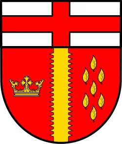 Blasonierung: „Unter silbernem Schildhaupt mit durchgehendem rotem Kreuz in Rot goldener Dornenpfahl, vorn goldene, dreizackige Krone, hinten sieben goldene Erlenblätter.“[8] |