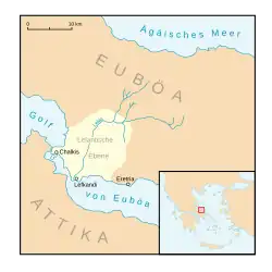 Euboia war ein bedeutendes Handelszentrum, wie beispielsweise daran ersichtlich ist, dass die euboiischen Gewichts- und Maßeinheiten im gesamten ionischen Gebiet und bis in die Zeit Solons auch in Athen gebräuchlich waren.[9] Chalkis und Eretria waren rivalisierende Städte. Eine der frühesten überlieferten Seeschlachten Griechenlands fand um 711 v. Chr.im Lelantischen Krieg zwischen diesen beiden Städten statt, und viele andere griechische Stadtstaaten sollen sich daran beteiligt haben.