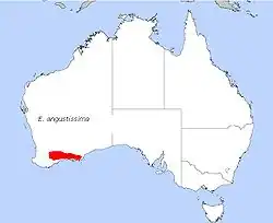 Das natürliche Verbreitungsgebiet von Eucalyptus angustissima liegt nur in Western Australia, hauptsächlich in den Gemeindegebieten von Esperance und Woodanilling.[3]