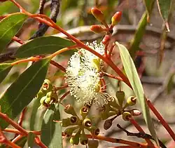 Seitenständig[5] an einem bei einer Länge von 7 bis 12 mm und einer Breite von bis zu 3 mm im Querschnitt schmal abgeflachten oder kantigen Blütenstandsschaft stehen in einem einfachen Blütenstand elf bis dreizehn Blüten zusammen. Die 1 bis 5 mm langen Blütenstiele sind stielrund. Die nicht blaugrün bemehlten oder bereiften Blütenknospen sind bei einer Länge von 5 bis 8 mm und einem Durchmesser von 3 bis 4 mm zylindrisch oder eiförmig[4][5]. Die Kelchblätter bilden eine Calyptra, die früh abfällt. Die glatte Calyptra[5] ist halbkugelig oder konisch,[4][5] doppelt so lang wie der glatte Blütenbecher (Hypanthium) und so breit dieser,[5] oder auch ebenso lang wie der Blütenbecher und schmäler als dieser.[4] Die |Blüten sind weiß, cremeweiß.[5] oder gelb.[5][3] Die Blütezeit reicht in Western Australia von November bis Dezember.[3]