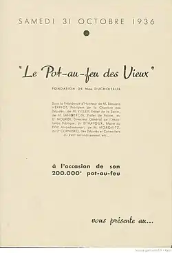 Eugénie Duchoiselle wurde in Auxerre geboren und war mit dem Architekten Francis Duchoiselle verheiratet. In den 1930er-Jahren gründete sie die „Pot-a-feu des Vieux“ (unter Vieux, also Alten, verstand sie Menschen über 75), in denen sie kostenlos Gerichte wie Eintöpfe, Crêpes oder Galettes servierte. Auch Lebensmittelpakete oder andere Produkte wie Kleidung[4] oder Kohle[5] gab sie ab. Finanziert wurden die Waren durch Wohltätigkeitsveranstaltungen, Bälle, Konzerte und Galas.[6] Dabei wurde sie von zahlreichen Prominenten wie Joséphine Baker[7], Michel Simon oder Marie „Missie“ Wassiltschikow unterstützt. Metzger unterstützten sie mit Preisnachlässen und Prominente und Freunde mit Spenden. Sie erklärte „avoir des amis un peu partout et en avoir assez pour ne pas être obligé d’aller demander toujours aux mêmes“ (sie habe überall und genügend Freunde, um nicht immer die gleichen fragen zu müssen).[8]