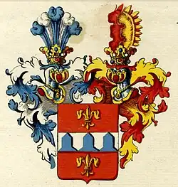 Ein roter Schild, durch dessen Mitte ein silberner Querbalken mit drei blauen Eisenhüten ging, und der zu Häupten und zu Füßen eine goldene Lilie wies. Den Schild bedeckten zwei gekrönte einwärtsgekehrte Helme. Der rechte mit fünf Straußenfedern, 1, 3, 5 blau, 2 und 4 silber. Auf dem linken Helm zwei die Sachsen einwärtsgekehrte Adlerflügel, der vordere gold, der hintere rot.