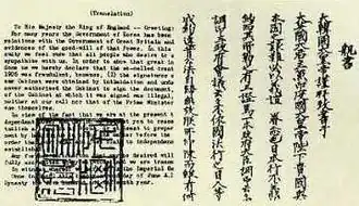 - ↑ Peter Duus, The Abacus and the Sword: The Japanese Penetration of Korea, 1895–1910, University of California Press, 1995, S. 192. Die hier wiedergegebene Übersetzung folgt der englischen Übersetzung.