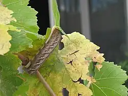 Die Raupen treten in sehr unterschiedlichen Farbvarianten auf. So erscheinen braune, rote oder grüne Individuen. Auffällig sind die weißen doppelpunktartigen Flecke oder Streifen an den Seiten der mittleren Segmente. Am Körperende befindet sich bei jüngeren Raupen ein kurzes Analhorn. Dieses verschwindet nach dem vierten Stadium. Bei ausgewachsenen Tieren ist anstelle des Analhorns nur noch ein dunkler Fleck zu erkennen.[2]