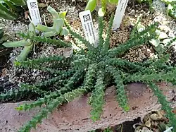 Die wenigen Zweige sind um einen Scheitel verteilt und werden bis zu 7,5 cm lang und erreichen einen Durchmesser von einem Zentimeter. Sie sind an der Basis vergrößert und besitzen spiralig angeordnete warzige Podarien. Ihre Blätter sind rudimentär und kurzlebig.