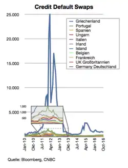 - ↑ spiegel.de 19. Juli 2012: Spaniens Risikoprämien steigen bedenklich Auch am Sekundärmarkt, wo die bereits früher ausgegebenen Staatsanleihen gehandelt werden, stiegen die Renditen für zehnjährige spanische Papiere auf über sieben Prozent. Bei Werten darüber gelten die Kosten für die Staatsfinanzierung langfristig als enorm schwierig.