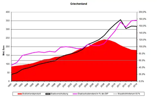 Obzwar (Stand April 2014) von Erfolgen hinsichtlich Haushaltsdefizit, „Primärüberschuss“ 2013 und „Rückkehr“ auf den Kapitalmarkt gesprochen wurde,[70] hatte sich der zum verringernden BIP (seit 2008) relative Schuldenstand (von 113 % 2008) auf 175 % des BIPs (trotz Schuldenschnitts und trotz/aufgrund verordneter Sparmaßnahmen durch die Troika) per Ende 2013 erhöht.[71] Griechenland befand sich seit März 2013 in der Deflation.[72] Die Troika forderte auch 2015 umfangreiche Strukturreformen und Haushaltskürzungen; sie hielt die griechischen Prognosen für zu optimistisch.[73][74]