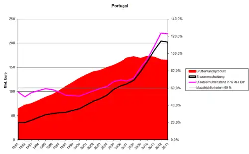 Die Staatsschuldenquote betrug 2007 etwa 68 Prozent des Bruttoinlandsprodukts, was damals in etwa dem Durchschnittswert des Euroraums von 66 Prozent wie auch dem Wert Deutschlands von 65 Prozent entsprach.[94] Portugal verletzte ebenso wie Griechenland seit der Euro-Einführung im Jahr 1999 durchweg das im Stabilitäts- und Wachstumspakt festgelegte Drei-Prozent-Kriterium bezüglich des maximal zulässigen Haushaltsdefizites. Der durchschnittliche Wert zwischen 1999 und 2007 betrug −4,1 Prozent.[95] 2013 betrug das Haushaltsdefizit 4,9 Prozent; das BIP sank real um 1,4 Prozent; die Währungsreserven sanken von 18,0 auf 14,3 Milliarden Euro.[96]