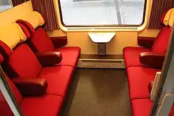 Die Innenraumgestaltung der Eurofima-Wagen korrespondierte ursprünglich mit der Außenlackierung, hier bei einem belgischen Wagen der 2. Klasse …