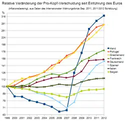 Lag die irische Schuldenquote 2007 noch bei besagten 25 %, steigerte sie sich in den Jahren 2008 und 2009, auch aufgrund staatlicher Unterstützungsmaßnahmen für den Finanzsektor, um jeweils etwa 20 Prozentpunkte und erreichte schließlich 2011 knapp 109 % des Bruttoinlandsproduktes.[75] Auch in Spanien kam es durch den Preis- und Nachfrageeinbruch auf dem Häusermarkt zu Verwerfungen. Nach Schätzungen der spanischen Nationalbank war die Krise zwischen 2007 und 2009 für einen Rückgang von knapp 4 % des Bruttoinlandsproduktes verantwortlich.[87] Die Belastungen des Bankensektors waren dabei geringer als in Irland, wenngleich die Rettungsmaßnahmen auch in Spanien den Staatshaushalt belasteten.[88]