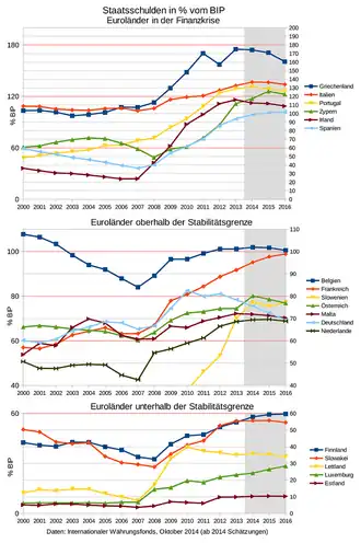 Obzwar (Stand April 2014) von Erfolgen hinsichtlich Haushaltsdefizit, „Primärüberschuss“ 2013 und „Rückkehr“ auf den Kapitalmarkt gesprochen wurde,[70] hatte sich der zum verringernden BIP (seit 2008) relative Schuldenstand (von 113 % 2008) auf 175 % des BIPs (trotz Schuldenschnitts und trotz/aufgrund verordneter Sparmaßnahmen durch die Troika) per Ende 2013 erhöht.[71] Griechenland befand sich seit März 2013 in der Deflation.[72] Die Troika forderte auch 2015 umfangreiche Strukturreformen und Haushaltskürzungen; sie hielt die griechischen Prognosen für zu optimistisch.[73][74]