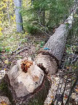 Biber sind reine Pflanzenfresser und nutzen die in ihrem Lebensraum häufigsten Pflanzenarten, in der Vegetationsperiode nehmen sie neben jungen Trieben und Blättern von Weichhölzern auch Gräser und krautige Pflanzen regelmäßig auf. Biber halten weder Winterschlaf noch Winterruhe, sondern sind auch im Winter im Wasser und an Land aktiv und auf Nahrungssuche.[37] Im Winter besteht ihre Nahrung vor allem aus Weichhölzern. Das nachgewiesene Nahrungsspektrum umfasst 150 krautige Pflanzenarten und 63 Gehölzarten.[9] Die Nahrung wird vor allem im Uferstreifen sowie am und im Gewässer gesucht. Vorzugsweise gefällt werden kleinere Bäume, die sich leicht aus dem Bestand herausziehen lassen. Überwiegend werden Bäume mit Stammdurchmessern von maximal 8 cm genutzt, häufig liegt er unter 3 cm.[1] Gefällte Bäume werden entastet, in Stücke zerlegt und zum Biberbau gebracht. Dort werden sie oft als Bauholz oder Nahrungsvorrat (Nahrungsflöße) verwendet.[1][9]