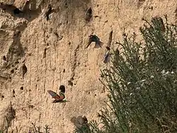 Der Bienenfresser ist ein Koloniebrüter. Das Nest wird als Bruthöhle in Hänge und Wände von Steilufern oder Sandgruben gegraben,[2] wobei die Brutpaare diese ziemlich nah beieinander anlegen. Besonders am Rande des Verbreitungsgebietes sind allerdings auch einzelne Brutpaare beobachtet worden. Solche Pionieransiedlungen verschwinden entweder bald oder vergrößern sich rasch zu Brutkolonien.