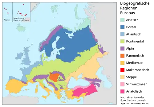 Die Vegetation in Europa lässt sich anhand des Klimas in vier Zonen einteilen: arktisch, boreal, gemäßigt und mediterran. Durch jahrtausendelange menschliche Umgestaltung und agrarische Nutzung des Lebensraums ist die ursprüngliche Vegetation Europas in der gemäßigten und mediterranen Zone selten. Vom Menschen weniger beeinflusste Bereiche gibt es vor allem in den höheren Lagen der Gebirge und in den über 400 Nationalparks des Kontinents.[11]