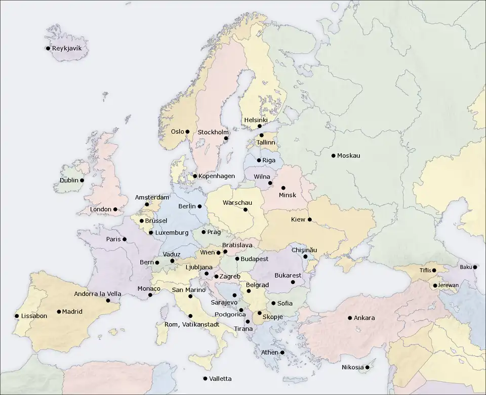 Je nach Ziehung der Grenze zwischen Europa und Asien (siehe Abschnitt Geographie) gibt es zurzeit 46 bis 49 souveräne Staaten, die ganz oder teilweise in Europa liegen (Hauptstädte in Klammern); die Zugehörigkeit Georgiens und Aserbaidschans sowie die Unabhängigkeit Kosovos sind dabei nicht eindeutig.