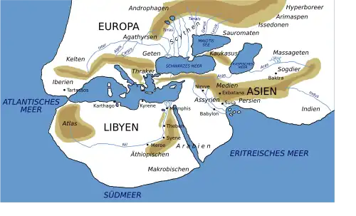 Von Europa ist schon im 6. Jahrhundert v. Chr. bei Anaximander von Milet die Rede.[3] Im 5. Jahrhundert vor Christus bezog der griechische Schriftsteller und Geograf Herodot den Begriff Eurṓpē, der als geografischer Begriff zunächst nur die Peloponnes bezeichnete,[4] auch auf die Landmassen nördlich des Mittelmeers und des Schwarzen Meers, die er so von Asien (Asía) und Afrika (Libýe) unterschied.